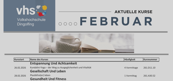 Ein Auswahl von Veranstaltungen die im Februar startenAls ein Blatt zum Ausdrucken.vhs News 02/26 - hier klicken